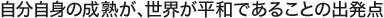そのうえで、経済力、軍事力だけに頼らず、世界が平和であることを求めるために、自分自身の成熟を出発点とすることが最善の道なのかもしれない。自分だけを守るために、お金や力や権力を求めるのではなく、家族、隣人、世界の人々すべてが守られ、生かされることを心から望んで自分を差し出してみる。自分には足りないものがたくさんあり、不完全であるということを受け入れ、他の人や民族に与えられている才能と協働し、補い合う関係づくりという生き方を選んでみる。自分の役割を理解し、出来なかったこと、失敗したこと、人を傷つけたことの責任を自分のものとし、心から赦しを請い、償いにふさわしい再生の行動を実践する。また傷つけられたときには赦す決心をし、お互いの和解と回復を心から願って行動する。