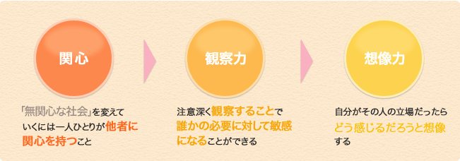 私たちが周りの人々に関心を抱くことが出来たら、次に、観察力と想像力が必要です。周りの人を良く観察しましょう。普段以上に肩を落としている誰かがいるかもしれません。泣きながらトイレから出てきたクラスメートがいるかもしれません。注意深く観察することで、私たちは必要に対して敏感になることが出来ます。