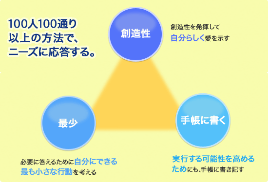 創造性を発揮し、必要に応答する小さな「種まき行動」を計画したら、それを手帳に書き込みましょう。このパートは非常に大切です。隣人を愛する行動は、手帳に書かなければ、それを実行する可能性は著しく低いものになってしまいます。それには理由があります。自分が必要を抱えている場合、それに対して何もしなければ困るのは自分ですが、他者の必要に応答しなくても自らは困らないからです。自分の歯が痛くて歯医者にいかなければさらに痛くなりますが、おばあちゃんを歯医者に連れていくのを忘れても自分の歯は痛くなりません。愛の種まきの内容と日付を、具体的に手帳に書いてみましょう。