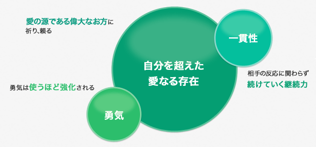 そして最後に「自分を超えた愛なる存在」の助けを得ることをお勧めします。私(筆者:陣内)自身、一貫性をもって愛することなど自分には出来ないと思っていました。 今でも出来るとは思いません。しかし、必要を見つけ、計画し、行動する時、「愛の源である偉大なお方」に祈り、頼ることは、私を大いに助けてくれました。これを書いている2010年9月で、足かけ6年間、私は「愛の行動の3ステップ」を毎週実践し続けています。控え目に言っても、私は変わりました。愛することは以前より易しくなりました。自分の一部のように、自然に人を愛する行動をしているときさえあります。もちろん出来ないときも難しい時もあります。しかし、この6年、継続してこのことに取り組んでくることが出来たのは、「自分を超えた愛なる存在」の助けがあったからだと言う以外ありません。