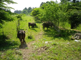 谷さんは農地の所有者から水田跡(1.5ヘクタール)を使用する許可を得ると共に、放れ牛を「餌づけ」することによって5頭の放れ牛を集めました。牛たちは田畑の雑草を「草刈り機」のように食べてくれ田畑を荒れ地化から守り、里山の回復に貢献しています。ここで二頭の子牛も生まれました。