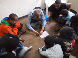 若者達とスタッフ。中心に座っている黒いジャケットの男性がスタッフのMikiでこのプログラムのリーダー。彼も元ストリートチルドレンでWSGの働きに助けられた1人。